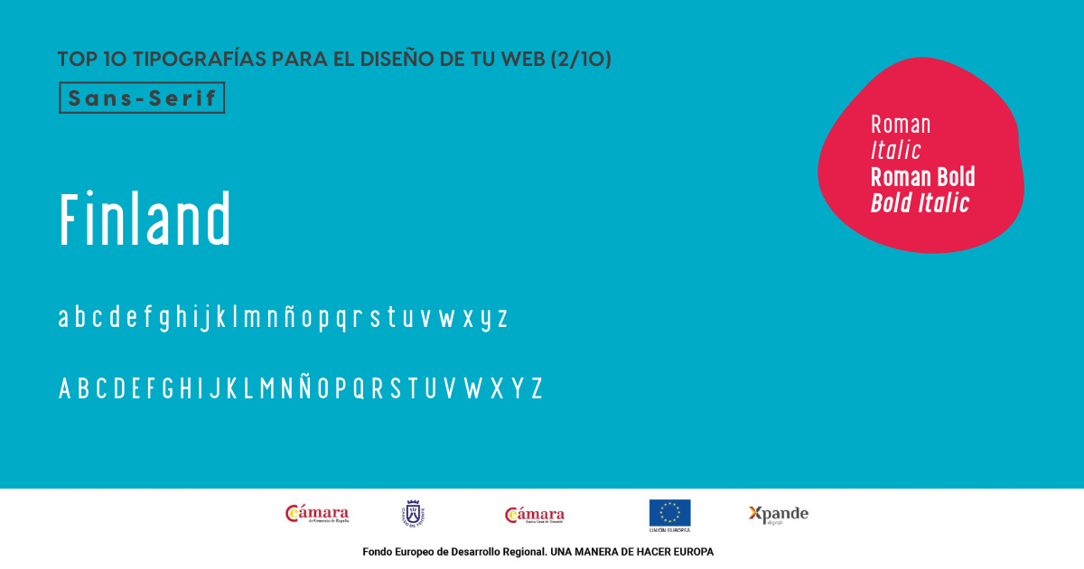 La fuente Finland presenta una estructura geométrica sans-serif, al igual que Averta. Esta evoca tendencia, estilo y modernidad, pero no se recomienda en textos largos porque podría generar una saturación visual.